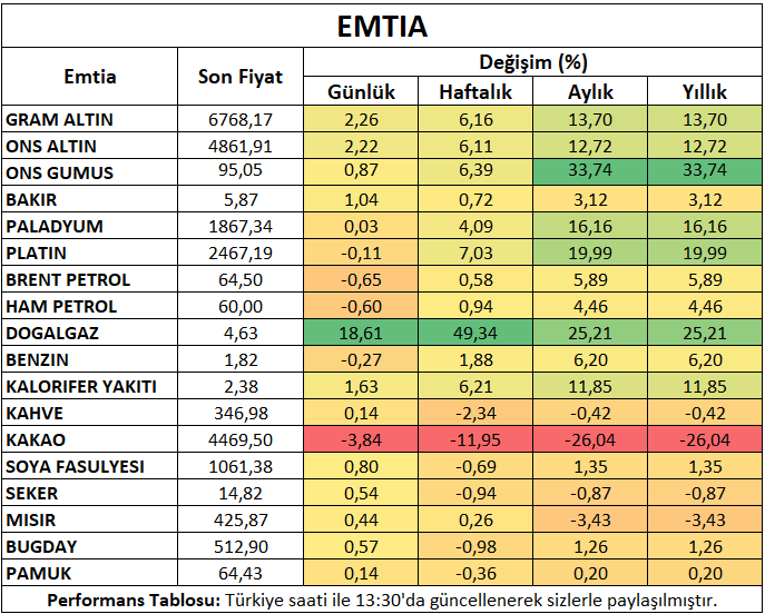 ABD doğal gaz vadeli işlemleri hafta ortasında agresif yükselişini sürdürdü. ABD’de hava tahminlerinin gittikçe daha soğuk koşulları işaret etmesi ısınma talebini destekleyerek fiyatları yukarı çekiyor. Soğuk havaların üretim koşullarını da olumsuz şekilde etkileyebileceği endişesi bulunuyor.