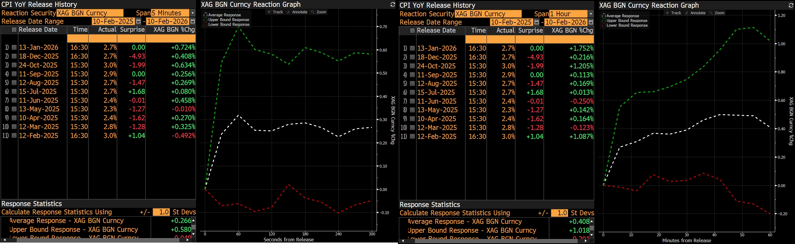 Gümüşte CPI sonrası ilk dakikalardaki tepki altına kıyasla daha sert ve oynak. 1 saatlik grafikte ise yükseliş ivmesinin belirgin şekilde arttığı ve ortalama getirinin altının üzerine çıktığı dikkat çekiyor. Bu durum, veri sonrası süreçte gümüşün momentum tarafında daha agresif bir performans sergilediğine işaret ediyor.