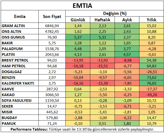 Sanayi metalleri ateşkes haberlerinden genel olarak pozitif etkilendi. Bakır yaklaşık üç haftanın en yüksek seviyelerine ulaştı. Platin ve paladyumda 5%’in üzerinde yükseliş takip edildi. Alüminyum ise arz endişelerinin azalması ile birlikte daha sakin bir seyir izledi.