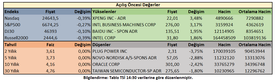 Piyasa açılışı öncesi işlemlerde ABD 10 yıllık tahvil faizi %4,16 oranında hareket ederken, hisse senedi endeksleri gerileme bölgesinde fiyatlanıyor.