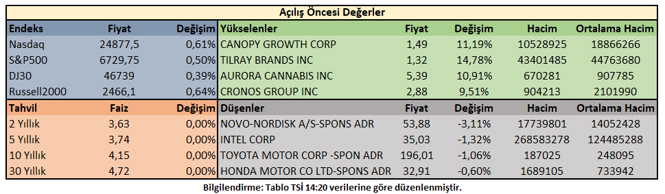 Piyasa açılışı öncesi işlemlerde, ABD 10 yıllık tahvil faizi %4,14 oranında hareket ederken, endekslerdeki toparlanmalarda Russell2000 başı çekiyor.