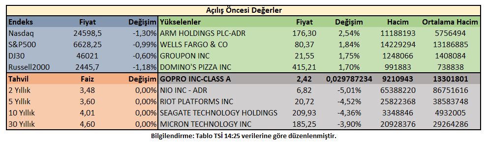 Piyasa açılışı öncesi işlemlerde ABD 10 yıllık tahvil getirisi %4,01 oranında hareket ederken, hisse senedi endeksleri satıcılı seyirde. Düşüşlere NASDAQ100 öncülük ediyor.