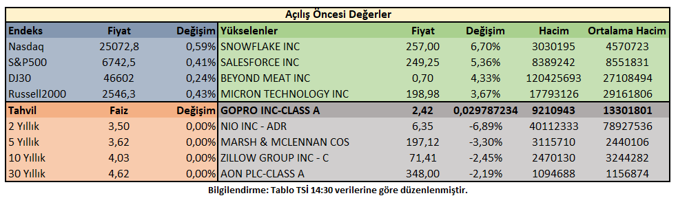 Piyasa açılışı öncesi işlemlerde; ABD 10 yıllık tahvil getirisi %4,02 oranında fiyatlanırken, hisse senedi endeksleri pozitif bölgede fiyatlanıyor. Yükselişlerde NASDAQ100 Endeksi öncülük ediyor.