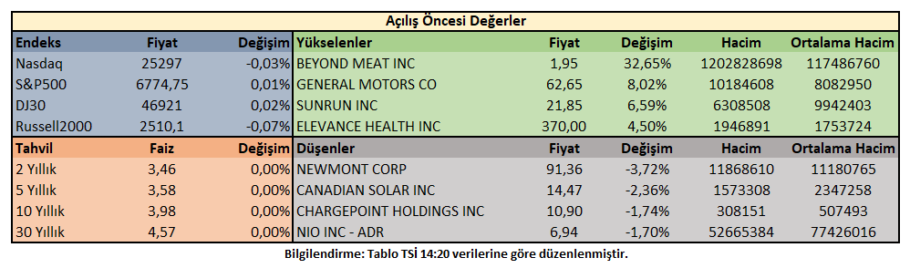 Piyasa açılışı öncesi işlemlerde; ABD 10 yıllık tahvil faizi %3,98 oranında hareket ederken, endeksler karışık ancak sınırlı değişim gösteriyor.