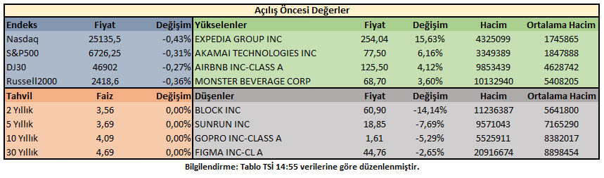 Piyasa açılışı öncesi işlemlerde; ABD 10 yıllık tahvil faizi 4,09% oranında hareket ederken; hisse senedi endeksleri gerileme gösteriyor.
