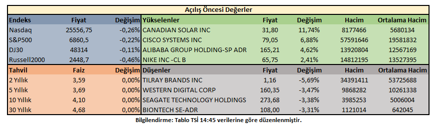 Piyasa açılışı öncesi işlemlerde; ABD 10 yıllık tahvil faizi 4,09% oranında hareket ederken; hisse senedi endeksleri gerileme gösteriyor.