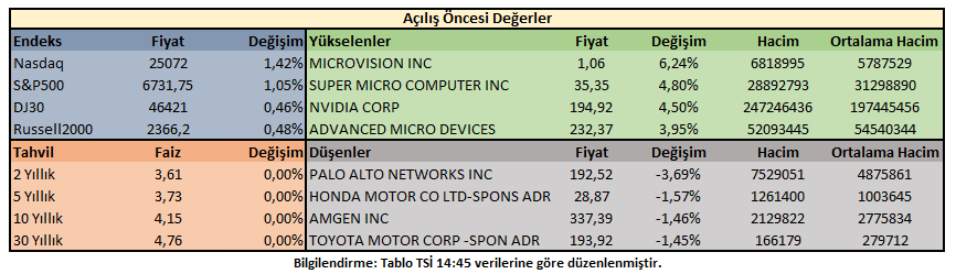 Piyasa açılışı öncesi işlemlerde; ABD 10 yıllık tahvil faizi 4,14% oranında hareket ederken; hisse senedi endeksleri yükseliş gösteriyor. Yükselişlerde NASDAQ100 Endeksi öne çıkıyor.