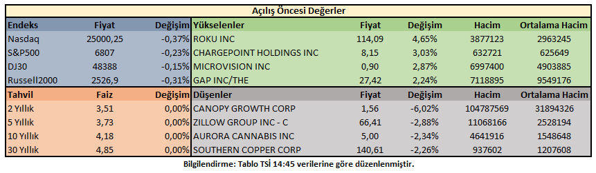 Piyasa açılışı öncesi işlemlerde ABD 10 yıllık tahvil getirisi %4,18 oranında hareket ediyor. Hisse senedi endekslerindeki düşüşlere NASDAQ100 öncülük ediyor.