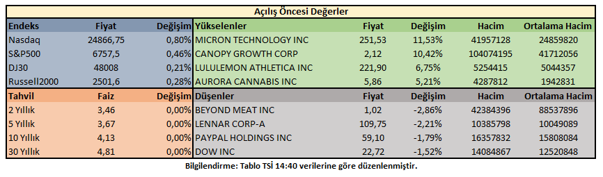 Piyasa açılışı öncesi işlemlerde ABD 10 yıllık tahvil getirisi %4,13 oranında hareket ediyor. Hisse senedi endekslerindeki toparlanmalara NASDAQ100 öncülük ediyor.