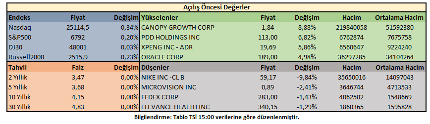 Piyasa açılışı öncesi işlemlerde; ABD 10 yıllık tahvil getirisi %4,15 oranında fiyatlanıyor. DJ30 haricinde hisse senedi endekslerindeki yükselişlere NASDAQ100 öncülük ediyor.