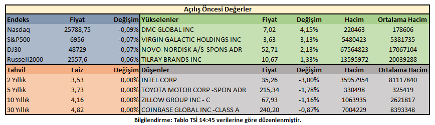 Piyasa açılışı öncesi işlemlerde; ABD 10 yıllık tahvil getirisi %4,14 oranında fiyatlanıyor. Hisse senedi endekslerinde oldukça düşük oranda kısa vadeli oynaklık izleniyor.