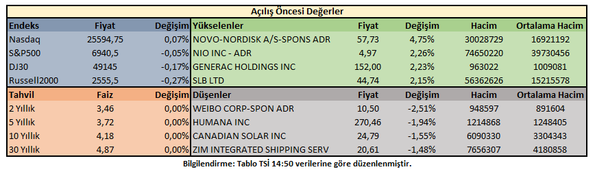 Piyasa açılışı öncesi işlemlerde gösterge tahvil faizi ABD 10 yıllıkları %4,18 oranında getiriye işaret ederken; hisse senedi endeksleri NASDAQ100 haricinde gerileme gösteriyor.