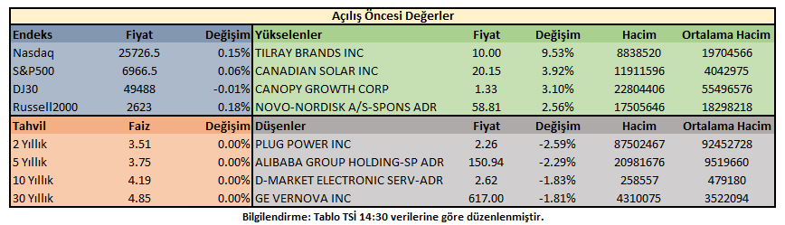 Piyasa açılışı öncesi işlemlerde gösterge tahvil faizi ABD 10 yıllıkları %4,19 oranında getiriye işaret ederken; hisse senedi endeksleri sınırlı yükseliş gösteriyor.