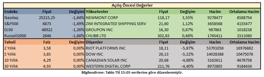 ABD 10 yıllık tahvil faizi %4,29 oranında hareket ederken, hisse senedi endeksleri NASDAQ100 öncülüğünde düşüş gösteriyor.