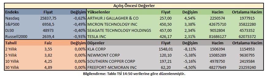 KLA Corp. (-8,11%) mali 2026 yılı ikinci çeyreklik dönem finansallarını sundu. Şirket 3,25 milyar dolar gelir beklentisine karşılık 3,3 milyar dolar gelir açıklarken, 1,15 milyar dolar kar beklentisini 1,16 milyar dolar ile geçti. Bu durumun yanında şirket bir sonraki çeyrek için 3,2 – 3,5 milyar dolar aralığında gelir öngörüsünde bulunurken, piyasa 3,29 milyar dolar gelir bekliyor. Bu durum daha yüksek beklentileri karşılamaması nedeniyle baskı oluşturuyor.