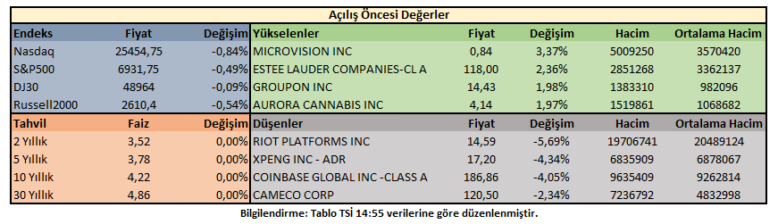 Bitcoin ve kripto para piyasasındaki gerilemeler; Bitcoin madencilik faaliyeti yürüten Riot Platforms (-5,69%) ve kripto paralara aracılık faaliyetleri yürüten Coinbase (-4,05%) hisse fiyatları üzerinde baskı yaratıyor. Cuma gününü 84 bin dolar civarından kapatan Bitcoin fiyatı, bugün 74 bin 500 dolar civarına kadar gerileme gösterdi.