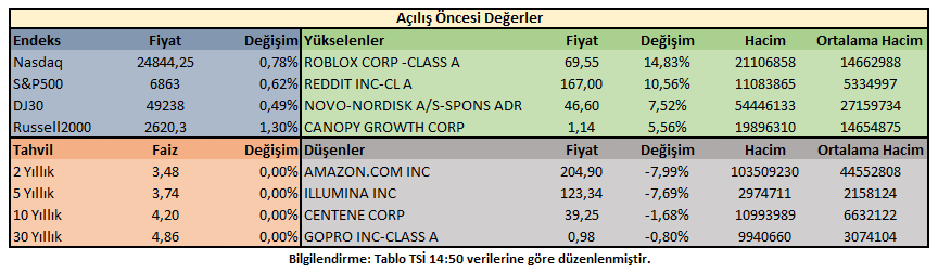 Hisse senetleri arasında; Roblox (14,83%) hisse fiyatı, 2025 yılı dördüncü çeyreklik dönem finansal tablolarını sundu. Şirket, piyasanın beklediği 1,43 milyar dolar gelir beklentisini 1,41 milyar ile kaçırırken; 325 milyon dolar net zarar beklentisinin altında 316 milyon dolar zarar açıkladı. Bu durumun yanında şirket 2026 yılında rezervasyonların 8,28 -8,55 milyar dolar aralığında olacağını öngörürken, piyasanın beklediği 8,05 milyar doların üzerinde bir öngörü sundu.