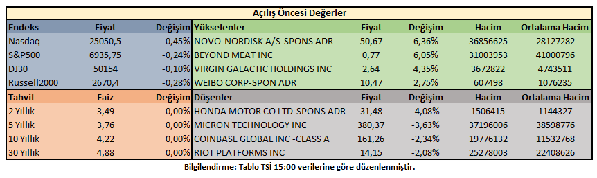 ABD 10 yıllık tahvil faizi %4,23 oranında hareket ederken; hisse senedi endeksleri gerileme bölgesinde, DJ30 ise 50.000 seviyesi üzerinde rekor bölgede işlem görüyor.