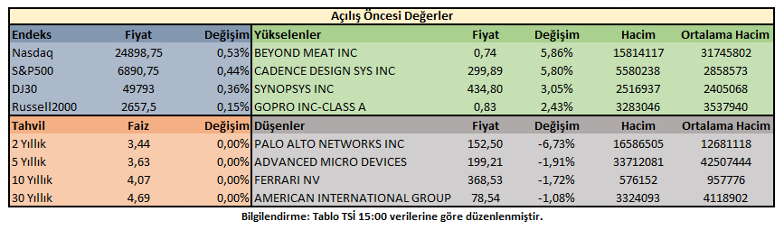 Piyasa açılışı öncesi işlemlerde; ABD 10 yıllık tahvil getirisi %4,07 oranında hareket ederken, hisse senedi endeksleri pozitif bölgede fiyatlanıyor. Yükselişlere NASDAQ100 öncülük ediyor.
