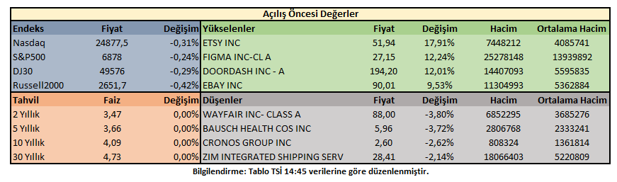 Piyasa açılışı öncesi işlemlerde; ABD 10 yıllık tahvil getirisi %4,1 oranında hareket ederken, hisse senedi endeksleri negatif bölgede fiyatlanıyor. Düşüşlere Russell2000 öncülük ediyor.