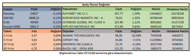 Piyasa açılışı öncesi işlemlerde; ABD 10 yıllık tahvil getirisi %4,07 oranında hareket ederken, hisse senedi endeksleri karışık ve sınırlı değişimden geçiyor.