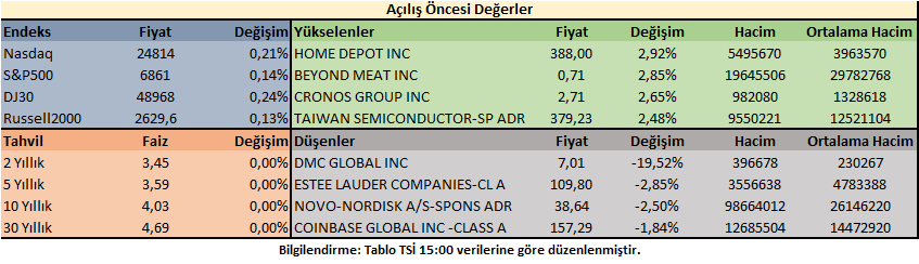Piyasa açılışı öncesi işlemlerde; ABD 10 yıllık tahvil getirisi %4,03 oranında hareket ederken, hisse senedi endeksleri yükseliş bölgesinde hareket ediyor.