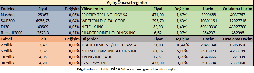 Piyasa açılışı öncesi işlemlerde; ABD 10 yıllık tahvil getirisi %4,05 oranında hareket ederken, hisse senedi endeksleri sınırlı oranda gerileme gösteriyor.