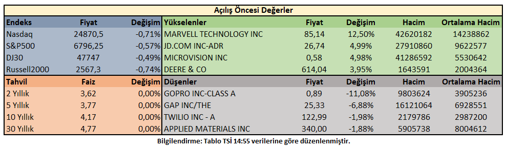 Piyasa açılışı öncesi işlemlerde; ABD 10 yıllık tahvil getirisi %4,17 oranında hareket ederken, hisse senedi endeksleri gerileme bölgesinde fiyatlanıyor.