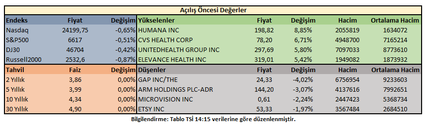 ABD hükümetinin Medicare Advantage planları için 2027 ödeme oranlarında beklenenden daha büyük bir artış planladığını açıklamasının ardından, Humana (8,85%), CVS Health (6,71%), UnitedHealth (5,80%) ve Elevance Health (5,42%) gibi ABD sağlık sigorta şirketlerinin hisseleri Salı günü piyasa öncesi işlemlerde yükseldi. Medicare ve Medicaid Hizmetleri Merkezleri Pazartesi günü, yaşlı yetişkinlere Medicare Advantage planları sunan özel sigorta şirketlerine yapılan ödemeleri 2027'de ortalama %2,48 oranında artıracağını açıkladı. Bu oran Ocak ayında önerilen %0,09'luk artıştan daha yüksek.