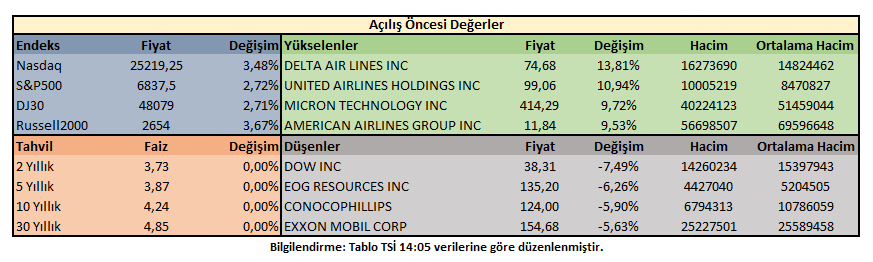 Bu durum petrol fiyatlarının %14 civarında gerilemesine alan açarken, enflasyonist endişeleri bir miktar da olsa törpüledi. 10 yıllık tahvil faizi %4,24 ile son 3 haftanın en düşük seviyelerine geriledi. Hisse senedi endeksleri ise %2,5 oranı üzerinde yükselişle hareket ederken, yükselişlere Russell2000 Endeksi öncülük ediyor.