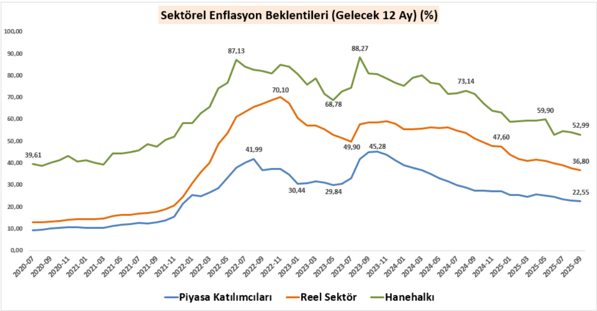 ** Günün ilk yarısında TCMB, Sektörel Enflasyon Beklentileri anketinin sonuçlarını yayımladı. Ankete göre, piyasa katılımcılarının 12 ay sonrasına ilişkin enflasyon beklentisi %22,25’e gerilerken, reel sektör beklentisi %36,80 seviyesine düştü. Hanehalkının enflasyon beklentisi ise azalış göstererek %52,99’a geriledi. Genel çerçevede, beklentilerde düşüş izleniyor olsa da, piyasa katılımcıları ile reel sektör ve hanehalkı arasındaki makasın devam ettiği dikkat çekiyor.