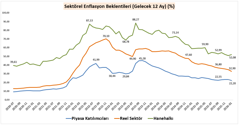 ** Günün ilk yarısında Sektörel Enflasyon Beklentileri açıklandı. Ocak ayı verileri, piyasa katılımcıları ve reel sektör beklentilerinde sınırlı bir iyileşmeye işaret ederken, hanehalkı beklentilerinde yukarı yönlü bir hareket izlendiğini göstermektedir. Bu görünüm, dezenflasyon sürecinde beklenti kanalının piyasa ve üretici tarafında daha olumlu seyrettiğini, hanehalkı tarafında ise beklentilerin yüksek seviyelerde kalmaya devam ettiğini ortaya koymaktadır. Söz konusu ayrışmanın, para politikasının etkilerinin ekonominin farklı kesimlerine farklı hızlarda yansıdığını ve beklentilerdeki yakınsamanın zaman alabileceğini düşündürdüğü söylenebilir.