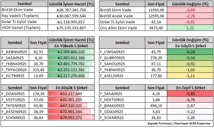 Bist30 Ekim vade sözleşme fiyatı günü yüzde 2,69 düşüşle 11.930 seviyesinden kapattı. Viop tarafında işlem gören şirketlerin günlük performansını (Eylül vade) değerlendirdiğimizde pozitif tarafta yer alan şirketler yokken, negatif tarafta dikkat çeken şirketlerse SASA ve HEKTS olarak kaydedilmiştir.