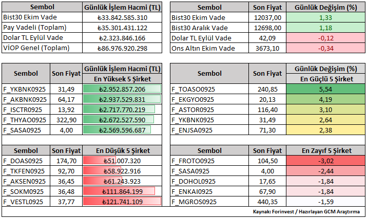 Bist30 Ekim vade sözleşme fiyatı günü yüzde 1,33 yükselişle 12.037 seviyesinden kapattı. Viop tarafında işlem gören şirketlerin günlük performansını (Eylül vade) değerlendirdiğimizde pozitif tarafta yer alan şirketler TOASO ve EKGYO, negatif tarafta dikkat çeken şirketlerse FROTO ve SASA olarak kaydedilmiştir.