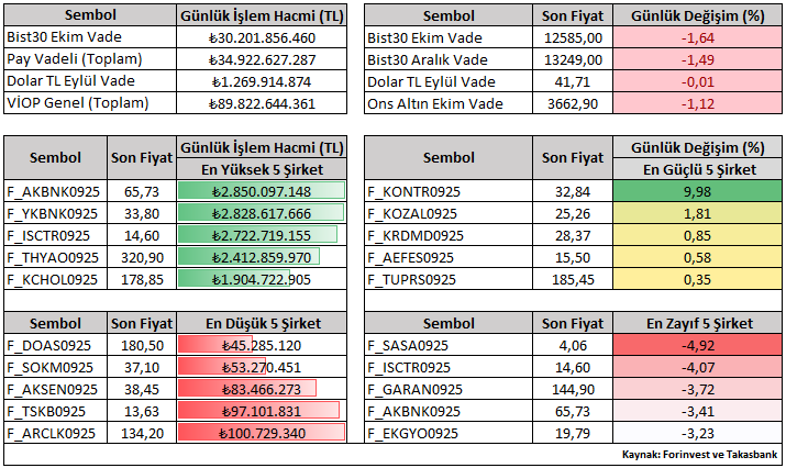 Bist30 Ekim vade sözleşme fiyatı günü yüzde 1,64 düşüşle 12.585 seviyesinden kapattı. Viop tarafında işlem gören şirketlerin günlük performansını (Eylül vade) değerlendirdiğimizde pozitif tarafta yer alan şirketler KONTR ve KOZAL iken, negatif tarafta yer alan şirketlerse SASA ve ISCTR olarak kaydedilmiştir.