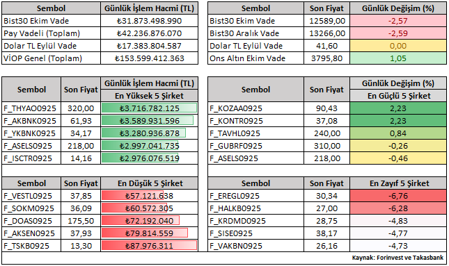 Bist30 Ekim vade sözleşme fiyatı günü yüzde 2,57 düşüşle 12.589 seviyesinden kapattı. Viop tarafında işlem gören şirketlerin günlük performansını (Eylül vade) değerlendirdiğimizde pozitif tarafta yer alan şirketler KOZAA ve KONTR iken, negatif tarafta yer alan şirketlerse EREGL ve HALKB olarak kaydedilmiştir.