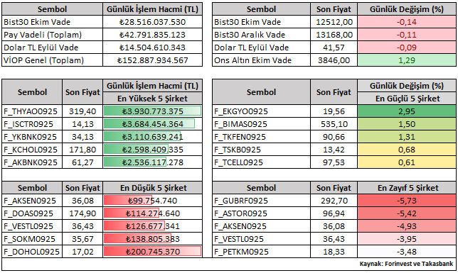 Bist30 Ekim vade sözleşme fiyatı günü yüzde 0,14 düşüşle 12.512 seviyesinden kapattı. Viop tarafında işlem gören şirketlerin günlük performansını (Eylül vade) değerlendirdiğimizde pozitif tarafta yer alan şirketler EKGYO ve BIMAS iken, negatif tarafta yer alan şirketlerse GUBRF ve ASTOR olarak kaydedilmiştir.