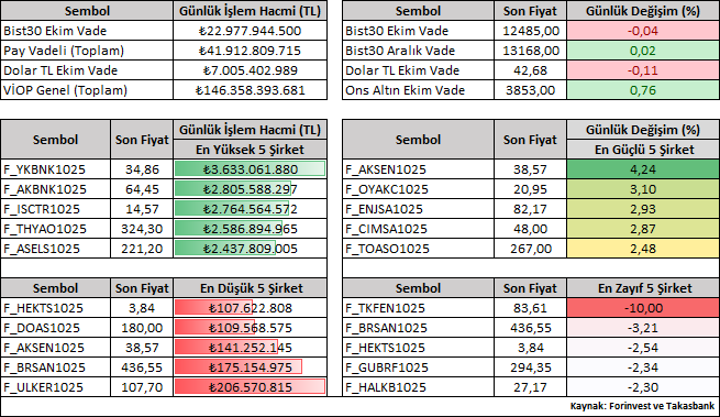 Bist30 Ekim vade sözleşme fiyatı günü yüzde 0,04 düşüşle 12.485 seviyesinden kapattı. Viop tarafında işlem gören şirketlerin günlük performansını (Ekim vade) değerlendirdiğimizde pozitif tarafta yer alan şirketler AKSEN ve OYAKC iken, negatif tarafta yer alan şirketlerse TKFEN ve BRSAN olarak kaydedilmiştir.