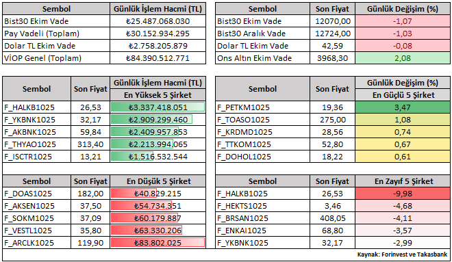 Bist30 Ekim vade sözleşme fiyatı günü yüzde 1,07 düşüşle 12.070 seviyesinden kapattı. Viop tarafında işlem gören şirketlerin günlük performansını (Ekim vade) değerlendirdiğimizde pozitif tarafta yer alan şirketler PETKM ve TOASO iken, negatif tarafta yer alan şirketlerse HALKB ve HEKTS olarak kaydedilmiştir.