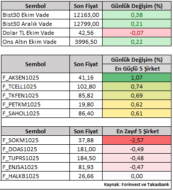 Bist30 Ekim vade sözleşme fiyatı günü yüzde 0,38 yükselişle 12.163 seviyesinden kapattı. Viop tarafında işlem gören şirketlerin günlük performansını (Ekim vade) değerlendirdiğimizde pozitif tarafta yer alan şirketler AKSEN ve TCELL iken, negatif tarafta yer alan şirketlerse SOKM ve DOAS olarak kaydedilmiştir.