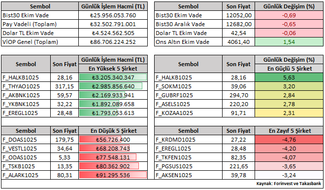 Bist30 Ekim vade sözleşme fiyatı günü yüzde 0,69 düşüşle 12.052 seviyesinden kapattı. Viop tarafında işlem gören şirketlerin günlük performansını (Ekim vade) değerlendirdiğimizde pozitif tarafta yer alan şirketler HALKB ve SOKM iken, negatif tarafta yer alan şirketlerse KRDMD ve EREGL olarak kaydedilmiştir.