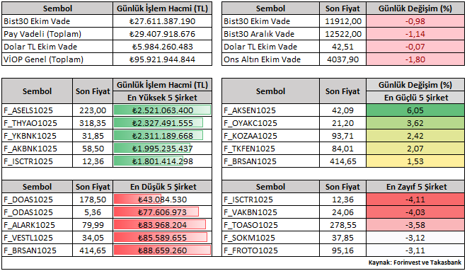 Bist30 Ekim vade sözleşme fiyatı günü yüzde 0,98 düşüşle 11.912 seviyesinden kapattı. Viop tarafında işlem gören şirketlerin günlük performansını (Ekim vade) değerlendirdiğimizde pozitif tarafta yer alan şirketler AKSEN ve OYAKC iken, negatif tarafta yer alan şirketlerse ISCTR ve VAKBN olarak kaydedilmiştir.
