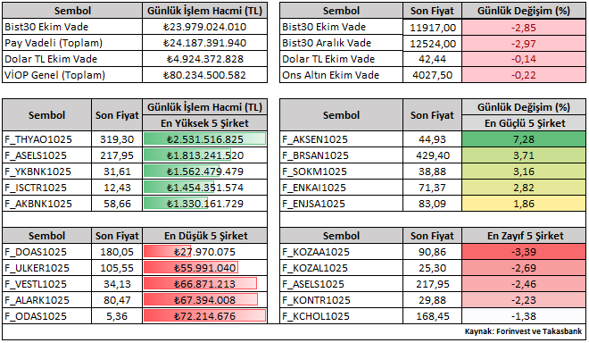 Bist30 Ekim vade sözleşme fiyatı günü yüzde 2,85 düşüşle 11.577 seviyesinden kapattı. Viop tarafında işlem gören şirketlerin günlük performansını (Ekim vade) değerlendirdiğimizde pozitif tarafta yer alan şirketler AKSEN ve BRSAN iken, negatif tarafta yer alan şirketlerse KOZAA ve KOZAL olarak kaydedilmiştir.
