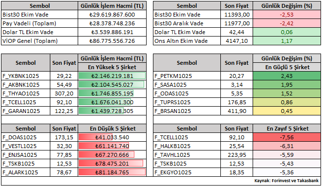 Bist30 Ekim vade sözleşme fiyatı günü yüzde 2,53 düşüşle 11.393 seviyesinden kapattı. Viop tarafında işlem gören şirketlerin günlük performansını (Ekim vade) değerlendirdiğimizde pozitif tarafta yer alan şirketler PETKM ve SASA iken, negatif tarafta yer alan şirketlerse TCELL ve HALKB olarak kaydedilmiştir.