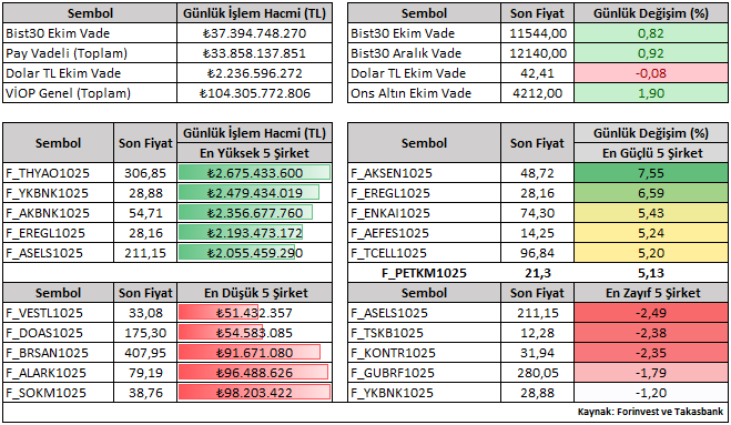 Bist30 Ekim vade sözleşme fiyatı günü yüzde 0,82 yükselişle 11.544 seviyesinden kapattı. Viop tarafında işlem gören şirketlerin günlük performansını (Ekim vade) değerlendirdiğimizde pozitif tarafta yer alan şirketler AKSEN ve EREGL iken, negatif tarafta yer alan şirketlerse ASELS ve TSKB olarak kaydedilmiştir.