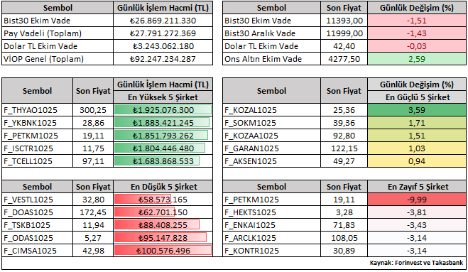 Bist30 Ekim vade sözleşme fiyatı günü yüzde 1,51 düşüşle 11.393 seviyesinden kapattı. Viop tarafında işlem gören şirketlerin günlük performansını (Ekim vade) değerlendirdiğimizde pozitif tarafta yer alan şirketler KOZAL ve SOKM iken, negatif tarafta yer alan şirketlerse PETKM ve HEKTS olarak kaydedilmiştir.