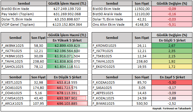 Bist30 Ekim vade sözleşme fiyatı günü yüzde 0,09 düşüşle 11.502 seviyesinden kapattı. Viop tarafında işlem gören şirketlerin günlük performansını (Ekim vade) değerlendirdiğimizde pozitif tarafta yer alan şirketler KRDMR ve ISCTR iken, negatif tarafta yer alan şirketlerse KOZAA ve SASA olarak kaydedilmiştir.