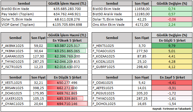 Bist30 Ekim vade sözleşme fiyatı günü yüzde 0,74 yükselişle 11.658 seviyesinden kapattı. Viop tarafında işlem gören şirketlerin günlük performansını (Ekim vade) değerlendirdiğimizde pozitif tarafta yer alan şirketler HEKTS ve TOASO iken, negatif tarafta yer alan şirketlerse ODAS ve AEFES olarak kaydedilmiştir.