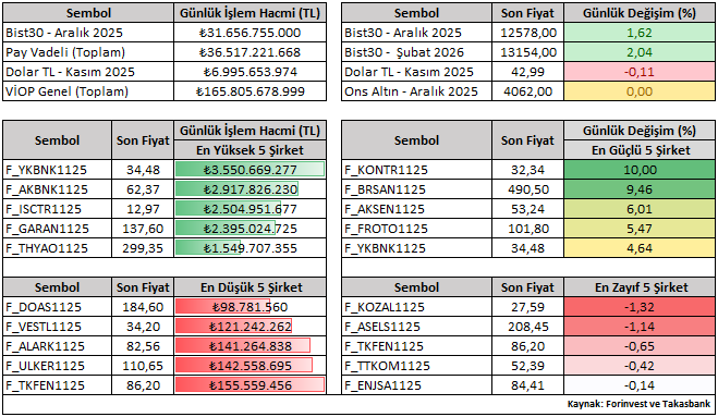 Bist30 Aralık vade sözleşme fiyatı günü yüzde 1,62 yükselişle 12.578 seviyesinden kapattı. Viop tarafında işlem gören şirketlerin günlük performansını (Kasım vade) değerlendirdiğimizde pozitif tarafta yer alan şirketler KONTR ve BRSAN iken, negatif tarafta yer alan şirketlerse KOZAL ve ASELS olarak kaydedilmiştir.