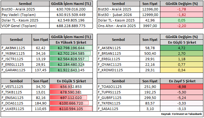 Bist30 Aralık vade sözleşme fiyatı günü yüzde 1,78 düşüşle 12.396 seviyesinden kapattı. Viop tarafında işlem gören şirketlerin günlük performansını (Kasım vade) değerlendirdiğimizde pozitif tarafta yer alan şirketler AKSEN ve BRSAN iken, negatif tarafta yer alan şirketlerse TOASO ve TUPRS olarak kaydedilmiştir.